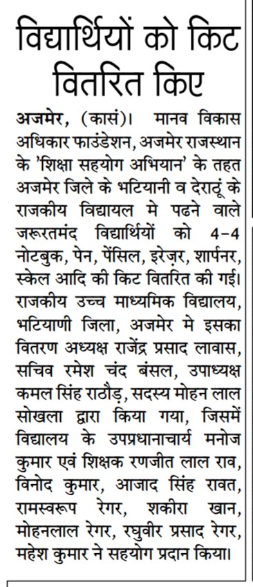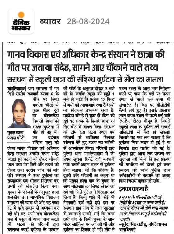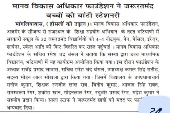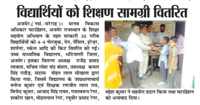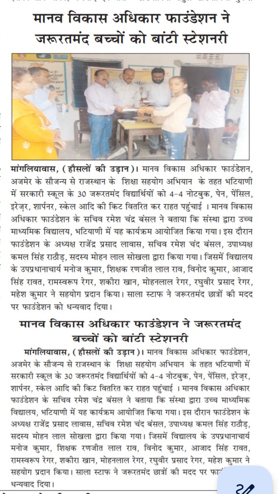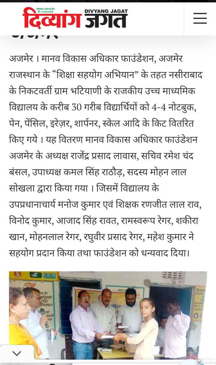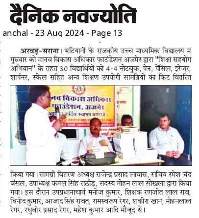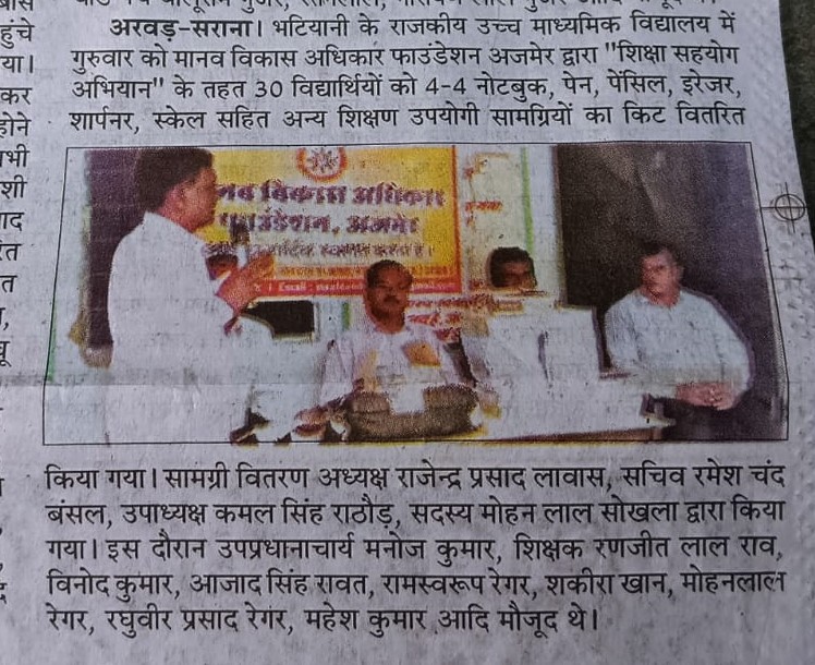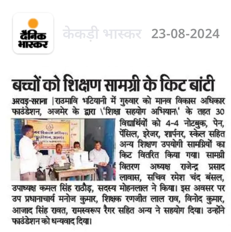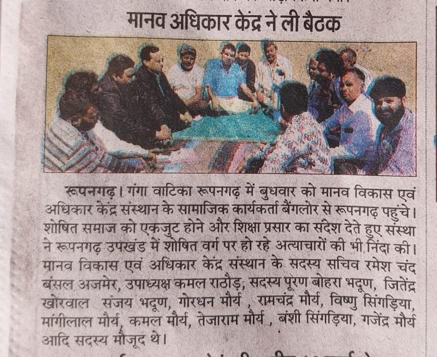 रूपनगढ 1 दिसम्बर 2024 मानव विकास एवं अधिकार केन्द्र संस्थान अजमेर द्वारा ग्राम नोसल तहसील रूपनगढ का संस्थान टीम द्वारा ग्राम में व्याप्त समस्याओ पर एक बैठक का आयोजन ब्लांक अध्यक्ष जगदीश जी की अध्यक्षता में किया गया जिसमे ग्राम के लगभग 80 लोगो ने भाग लिया गया। ग्रामीणों ने बताया कि आज भी कई वर्षो से रह रहे दलित एव कमजोर वर्ग के लोगो को उनकी भूमि आबादी में नहीं होने से उन्हे कई समस्याएॅंह ै और वे लाभ से वंचित है, इसके अलावा पानी की गंम्भीर समस्या है, पीने का पानी नही है ओर कुॅओ में पलोराइड युक्त पानी है जिसमे जिससे कई लोग बीमारियों से ग्रसित है, इसके अलावा कई विधवाओं की पेशन नही हुई है और कई लोगो के पेशन नही है। इसके अलावा राशन वितरण से वंचित है। इसके अलावा उनके मोहल्लों में रास्तो की समस्या के साथ सडके व नाली बनाने में भेदभाव किया जा रहा है। इस बाबत् उन्होने कई बार ग्राम पंचायत को इन समस्याओं से अवगत करवाया किन्तु इन लोगो की सुनवाई आज तक नही हुई है जिससे इन लोगो में रोष व्याप्त है और यदि शीध्र ही इनकी समस्याओं का समाधान नही हुआ तो वह आन्दोलन करेगे। संस्थान के द्वारा इनकी समस्याओं को जायजा लिया गया और शीध्र उच्च अधिकारियो को अवगत करवा कर इस पर शीध्र कार्यवाही करवायी जायेगी।